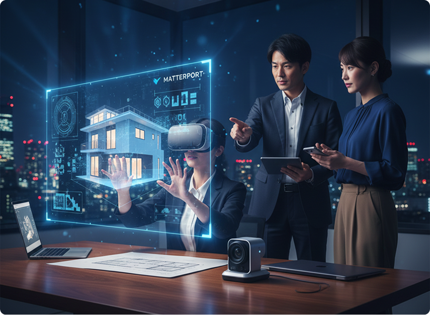 Matterportビューは、まるでその場にいるかのような没入感を提供する次世代の3Dウォークスルーサービスです。高精細な3Dスキャン技術により、建物の内部空間をバーチャルリアリティ(VR)で再現。離れた場所からでも、PCやスマートフォンで自由に空間内を移動し、細部まで確認できます。不動産の内覧、工事進捗の確認、災害時の状況把握など、様々なシーンで時間や場所の制約を超えた効率的な情報共有と意思決定を可能にします。