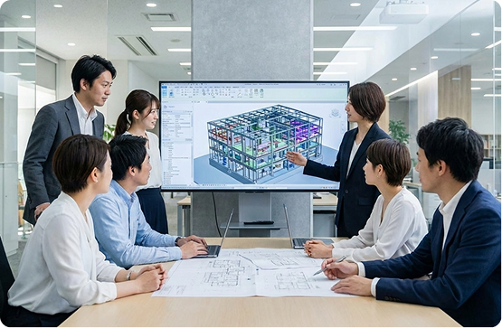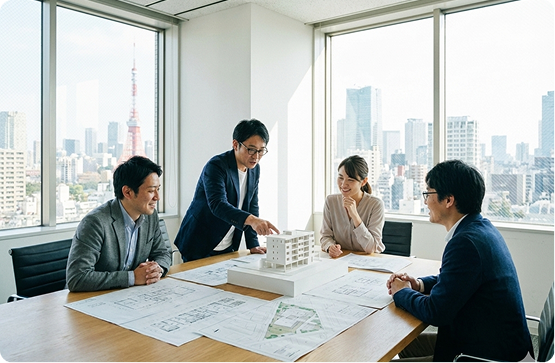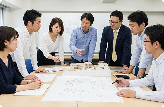 一級建築士に加え、構造・設備設計一級建築士、建築積算士、宅地建物取引士など、多様な国家資格を有するプロフェッショナルが多数在籍しています。異なる専門背景を持つスタッフがチームを組み、それぞれの視点から多角的に議論を交わすことで、単独の視点では見落としがちなリスクを回避。複雑に絡み合う課題に対しても、最も効果的で包括的な解決策を導き出します。