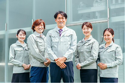 多様な専門資格を持つスタッフ(男女、幅広い年代)が自信に満ちた表情で並んでいる集合写真。人材の厚みを表現します。