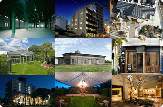 これまでに手掛けてきた多様な大規模プロジェクト(オフィスビル、商業施設、工場など)のコラージュや空撮写真。