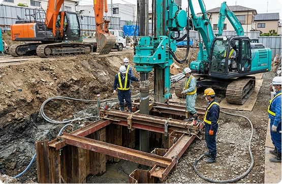 特殊な地盤改良工法など、他社では難しい技術的な施工現場の様子。専門性の高さを視覚的に伝えます。